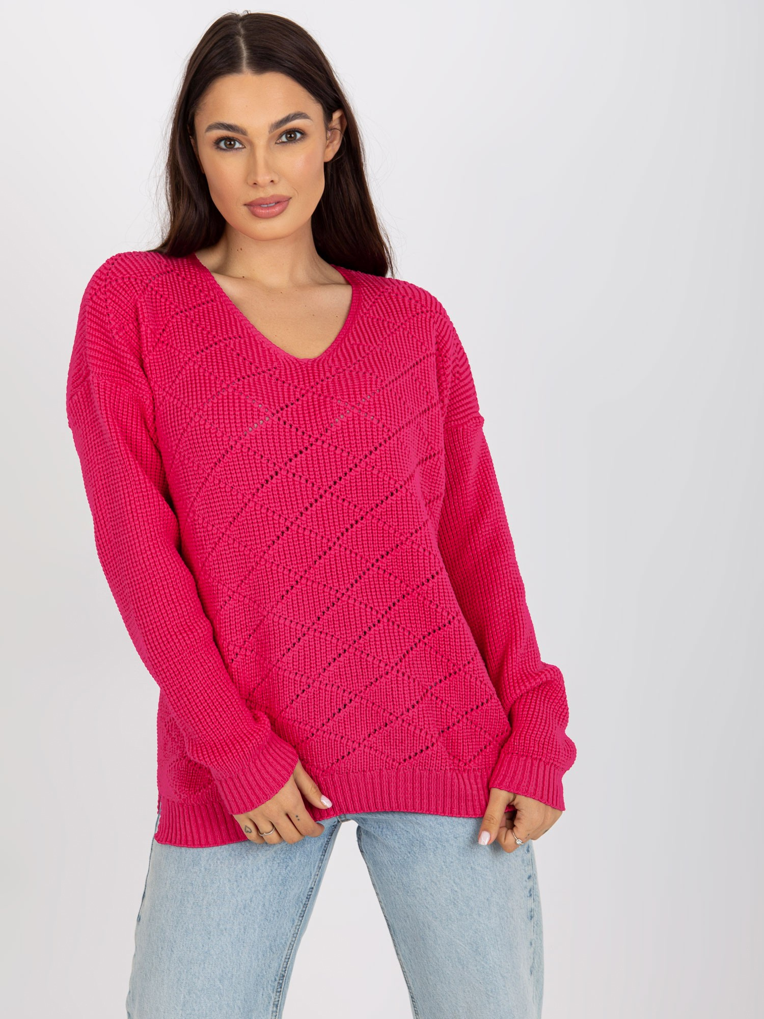 Fuksjowy gładki sweter oversize z dekoltem w serek .