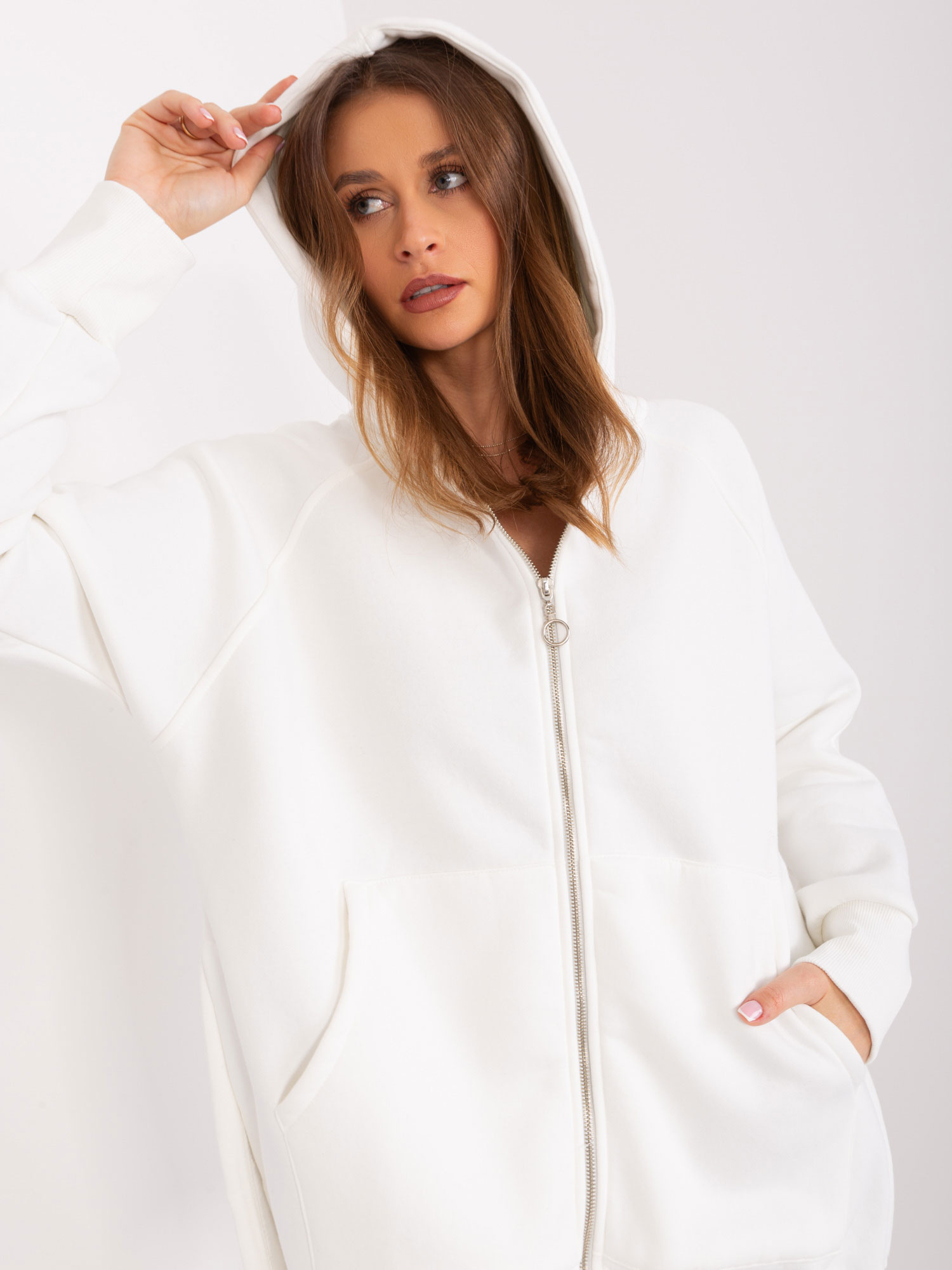 Modelka ma na sobie rozmiar XL/XXL. Wymiary modelki: wzrost 172 cm, biust 103 cm, talia 73 cm, biodra 103 cm.