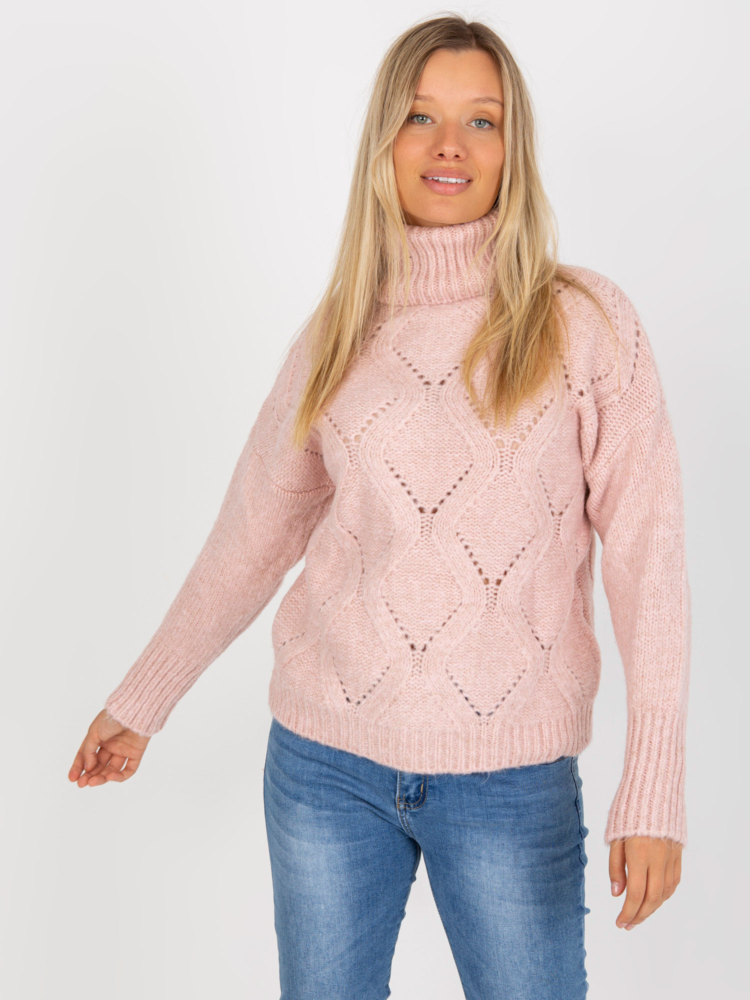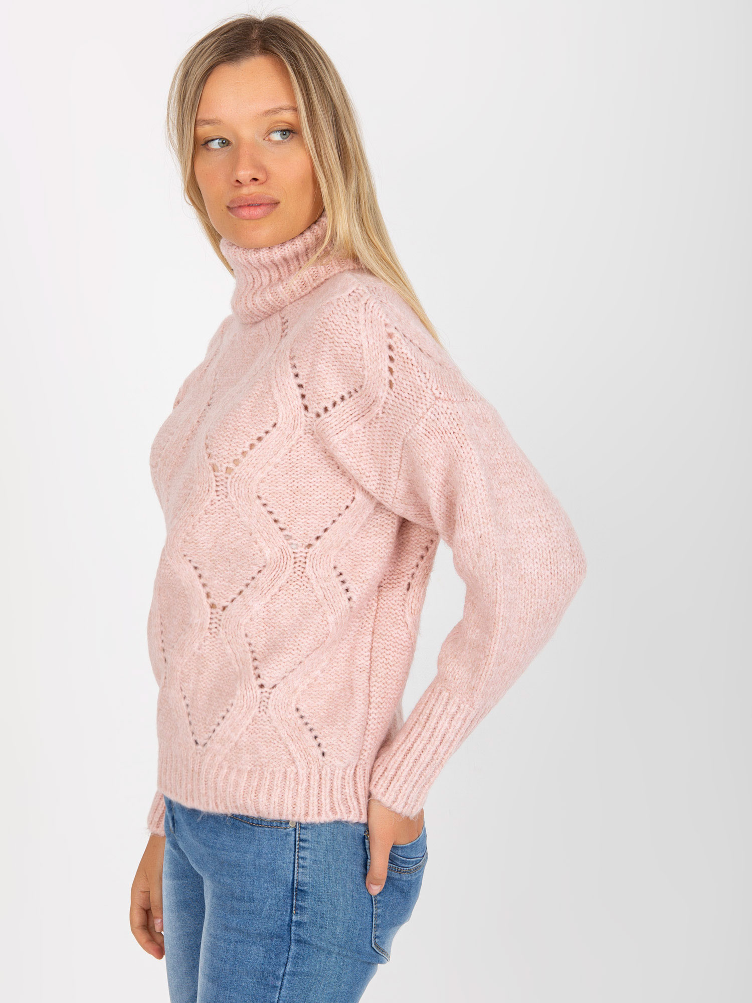 Jasnoróżowy sweter z golfem w ażurowy wzór RUE PARIS .