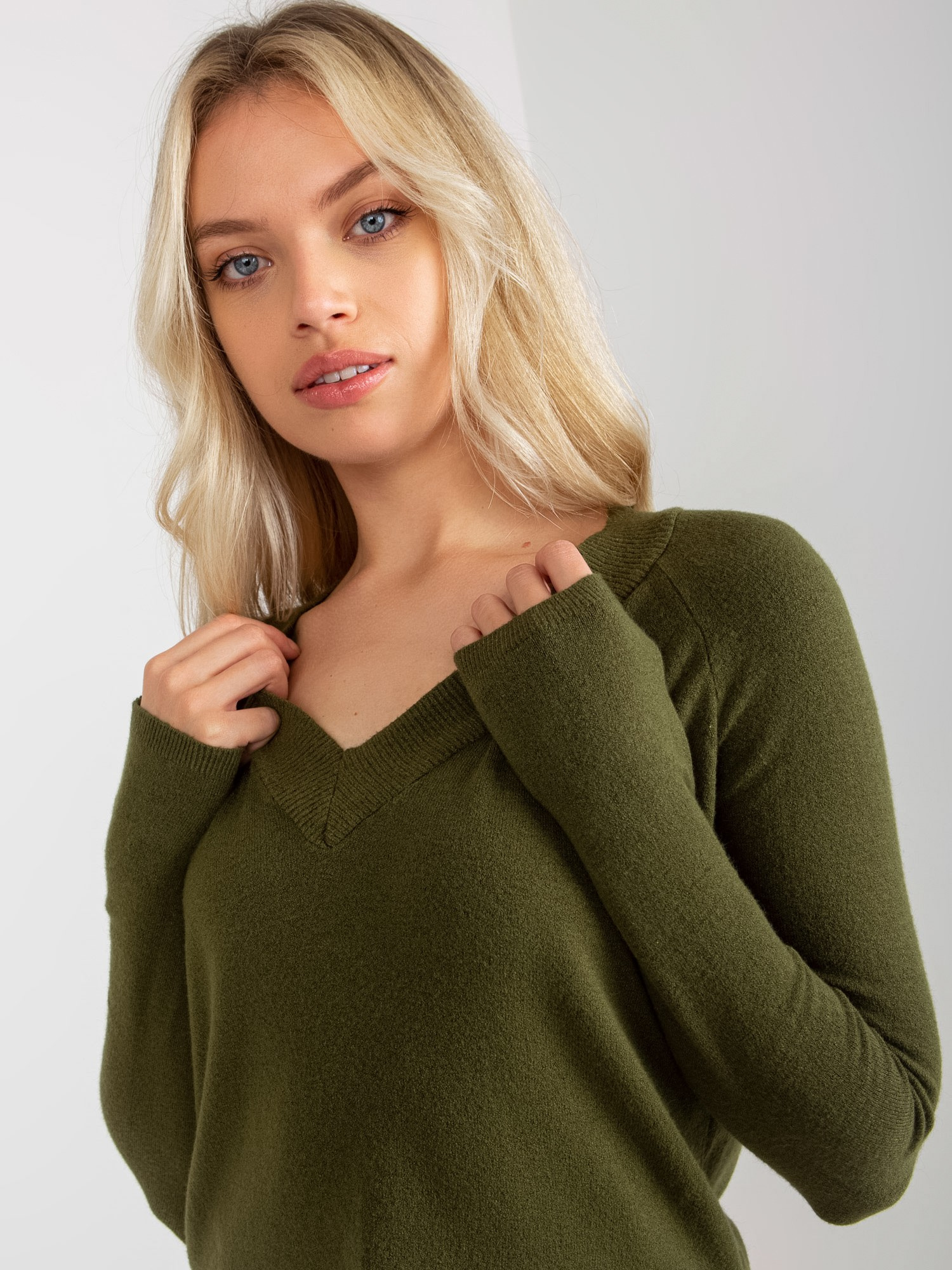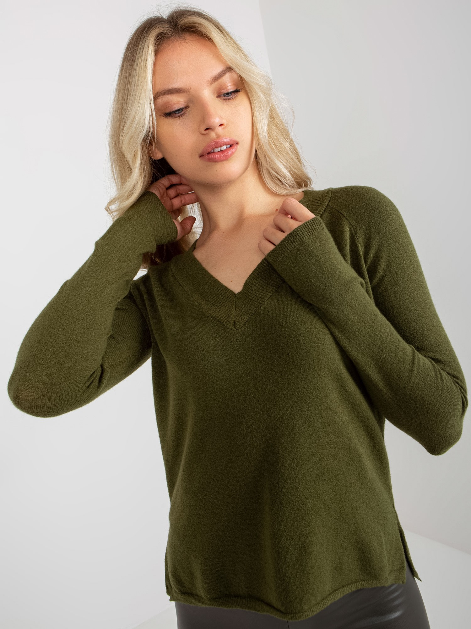 Khaki gładki sweter klasyczny z dekoltem w serek .