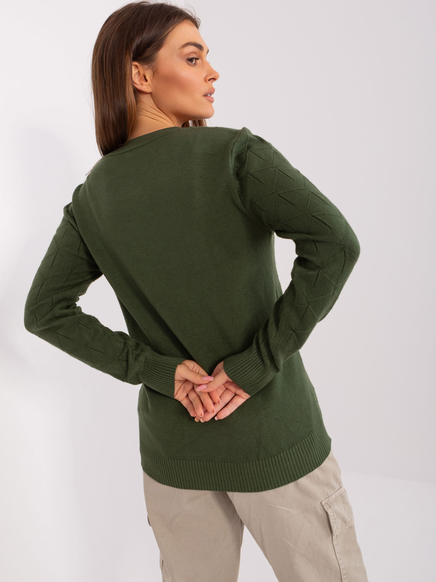 Khaki damski sweter klasyczny we wzory .
