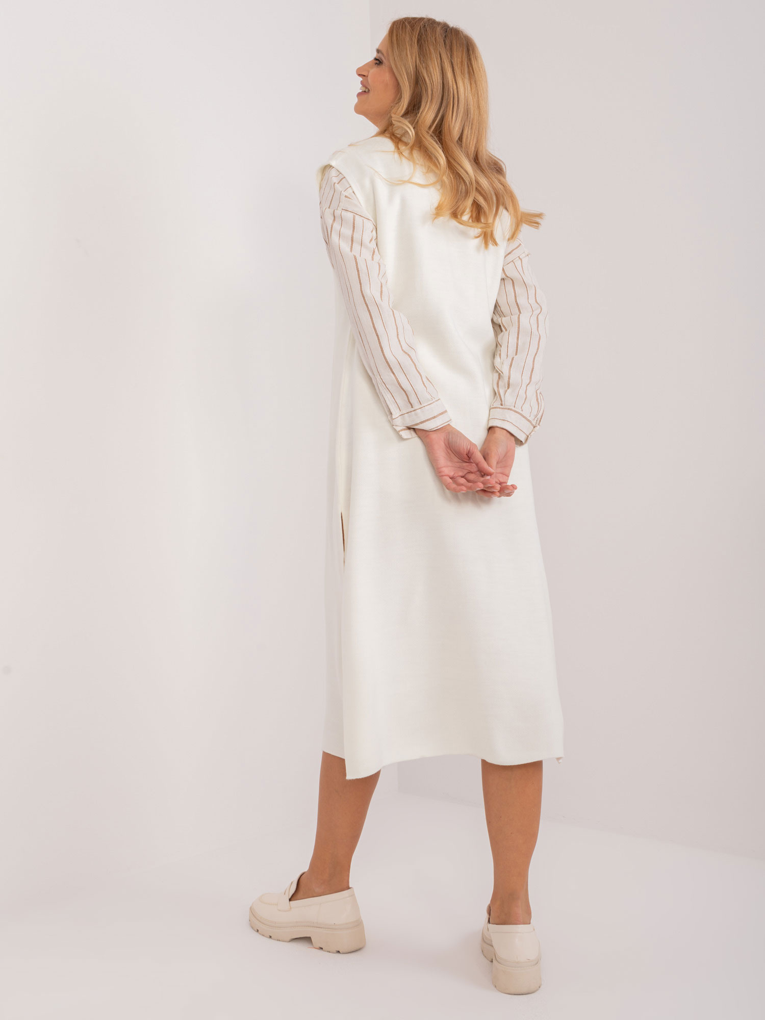 Wymiary swetra w rozmiarze one size mierzone na płasko: szerokość pod pachami – 49 cm, długość rękawa – 64 cm, długość całkowita – 67 cm.