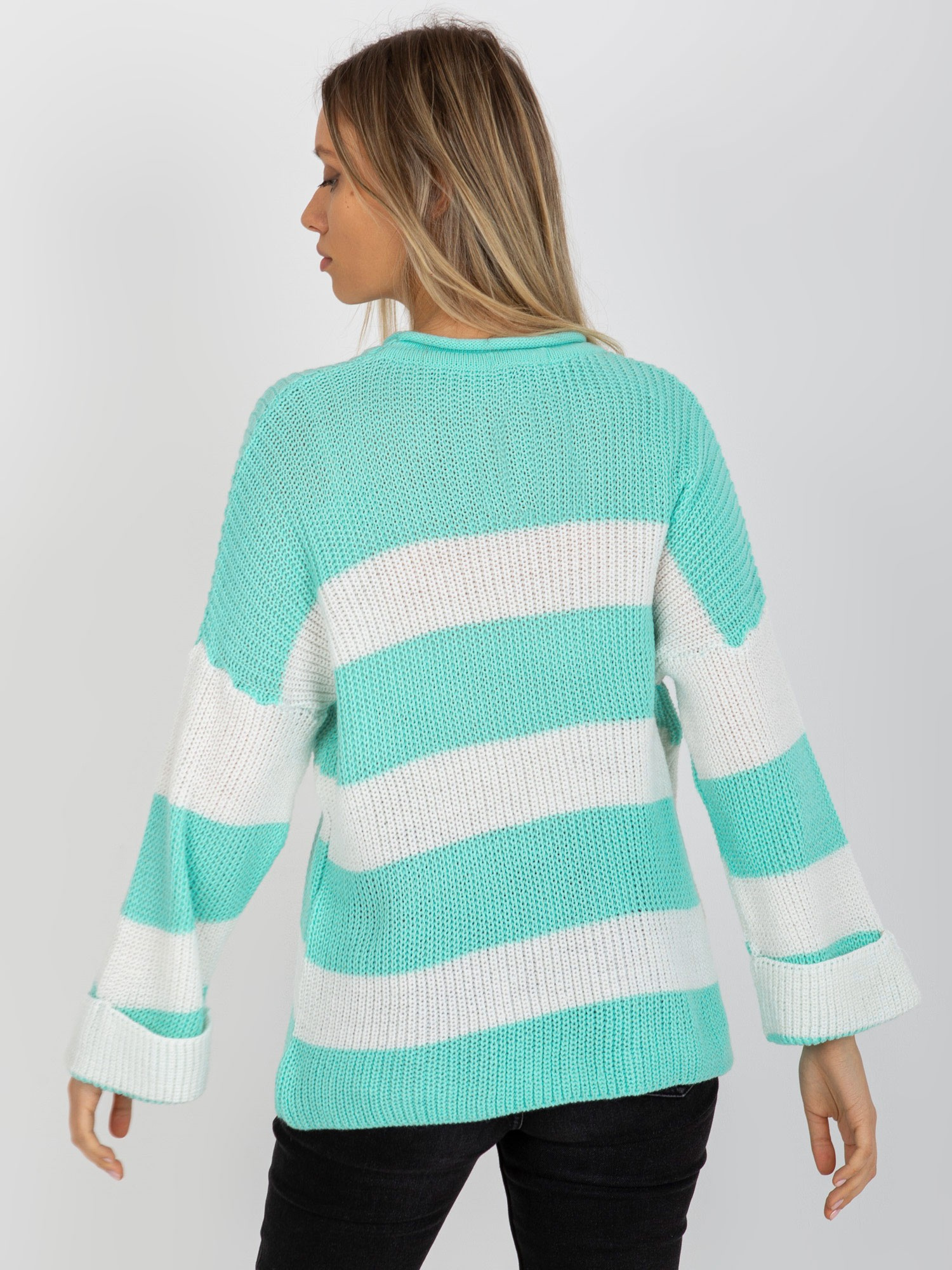 Wymiary swetra w rozmiarze one size mierzone na płasko: szerokość pod pachami – 67 cm, długość rękawa – 59 cm, długość całkowita – 62 cm.