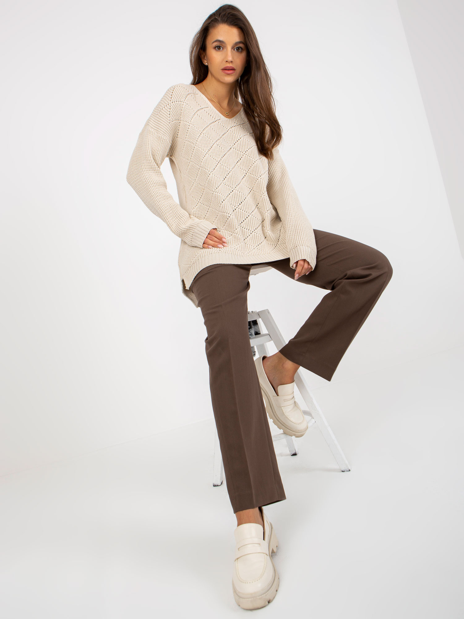 Wymiary swetra w rozmiarze S/M mierzone na płasko: szerokość pod pachami – 42 cm (materiał rozciągliwy), długość rękawa – 61 cm, długość całkowita – 63 cm.