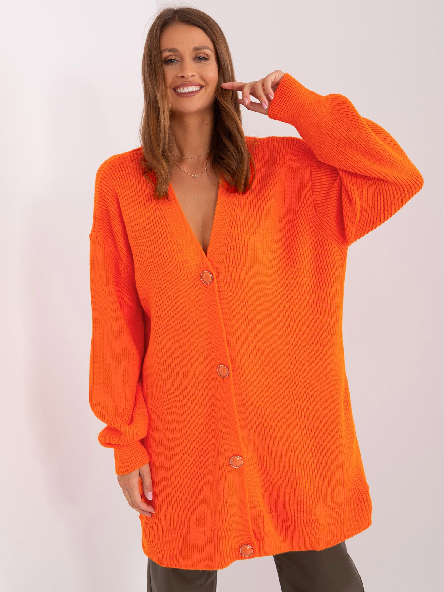 Pomarańczowy sweter rozpinany z dekoltem V .