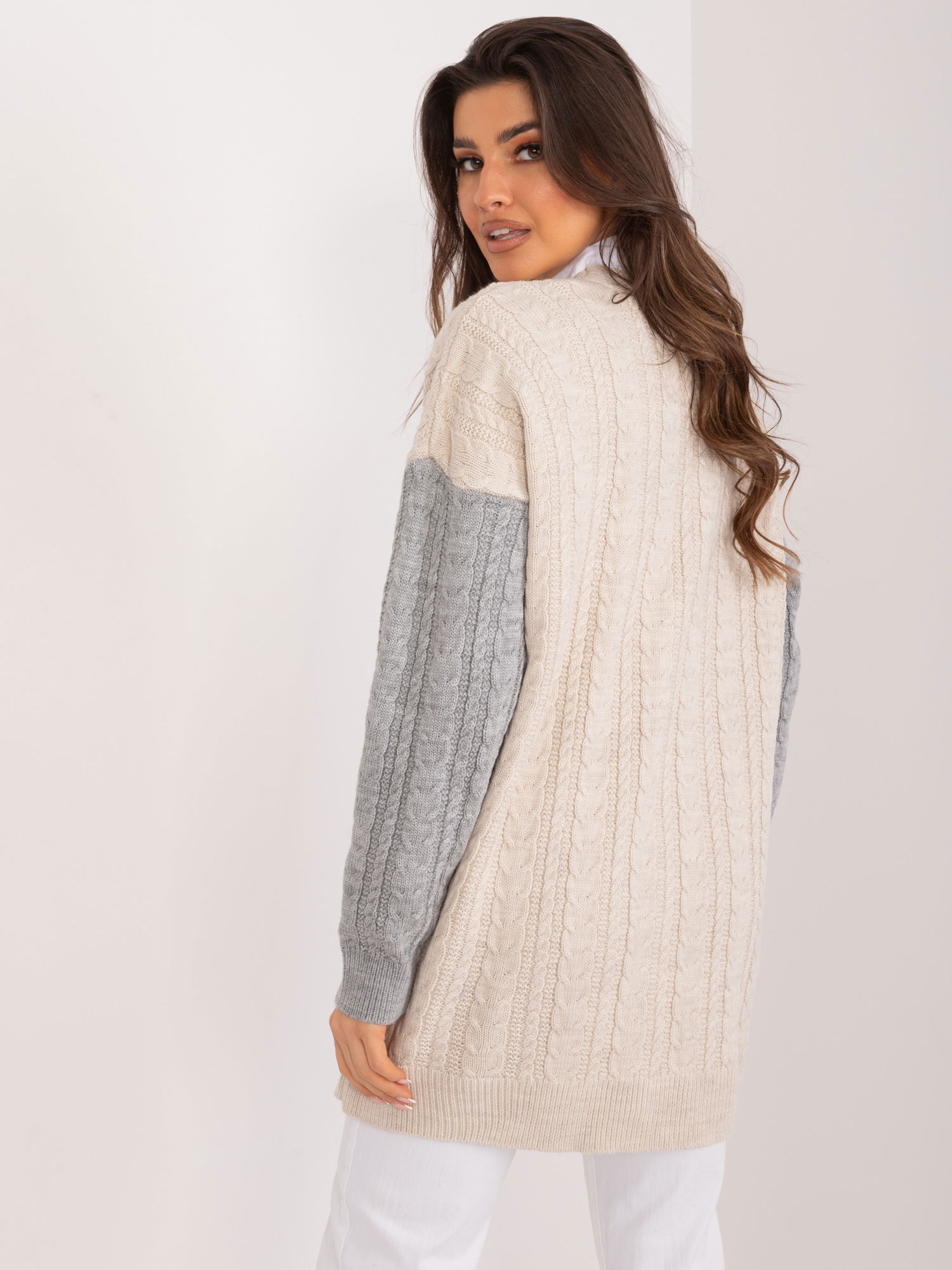 Wymiary swetra w rozmiarze one size mierzone na płasko: szerokość pod pachami – 65 cm, długość rękawa – 68 cm, długość całkowita – 78 cm.