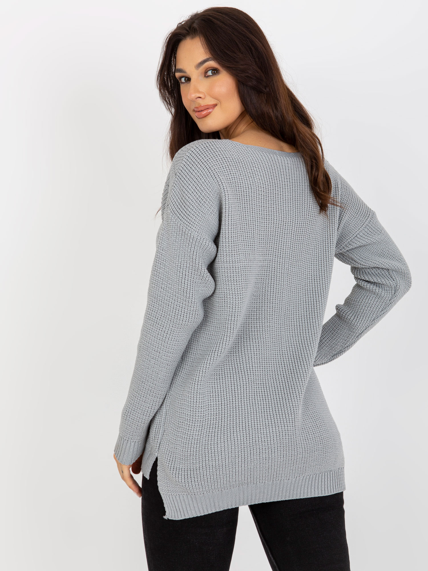 Szary gładki sweter oversize z dekoltem w serek .
