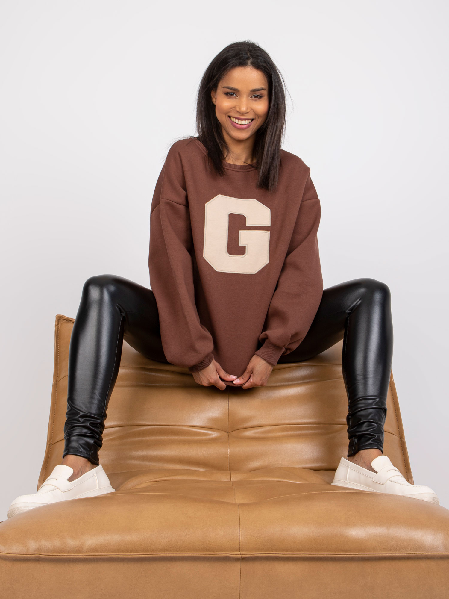 Wymiary swetra w rozmiarze one size mierzone na płasko: szerokość pod pachami – 50 cm, długość rękawa – 63 cm, długość całkowita – 62 cm.