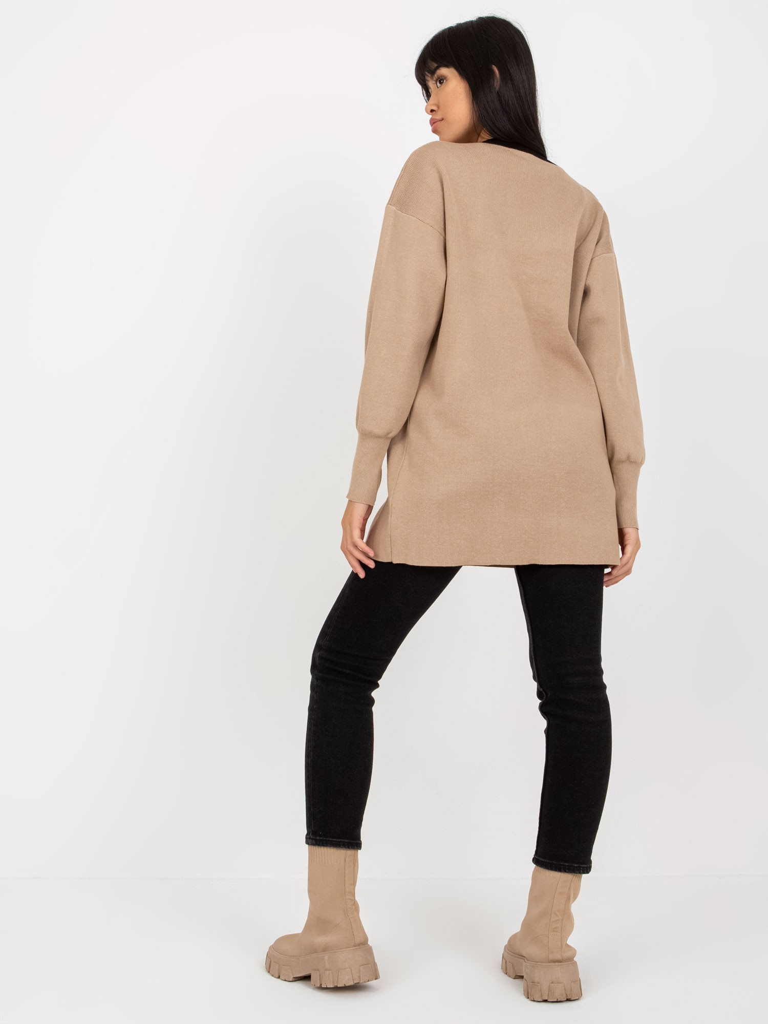 Wymiary swetra w rozmiarze one size mierzone na płasko: szerokość pod pachami – 55 cm, długość rękawa – 65 cm, długość całkowita – 62 cm.