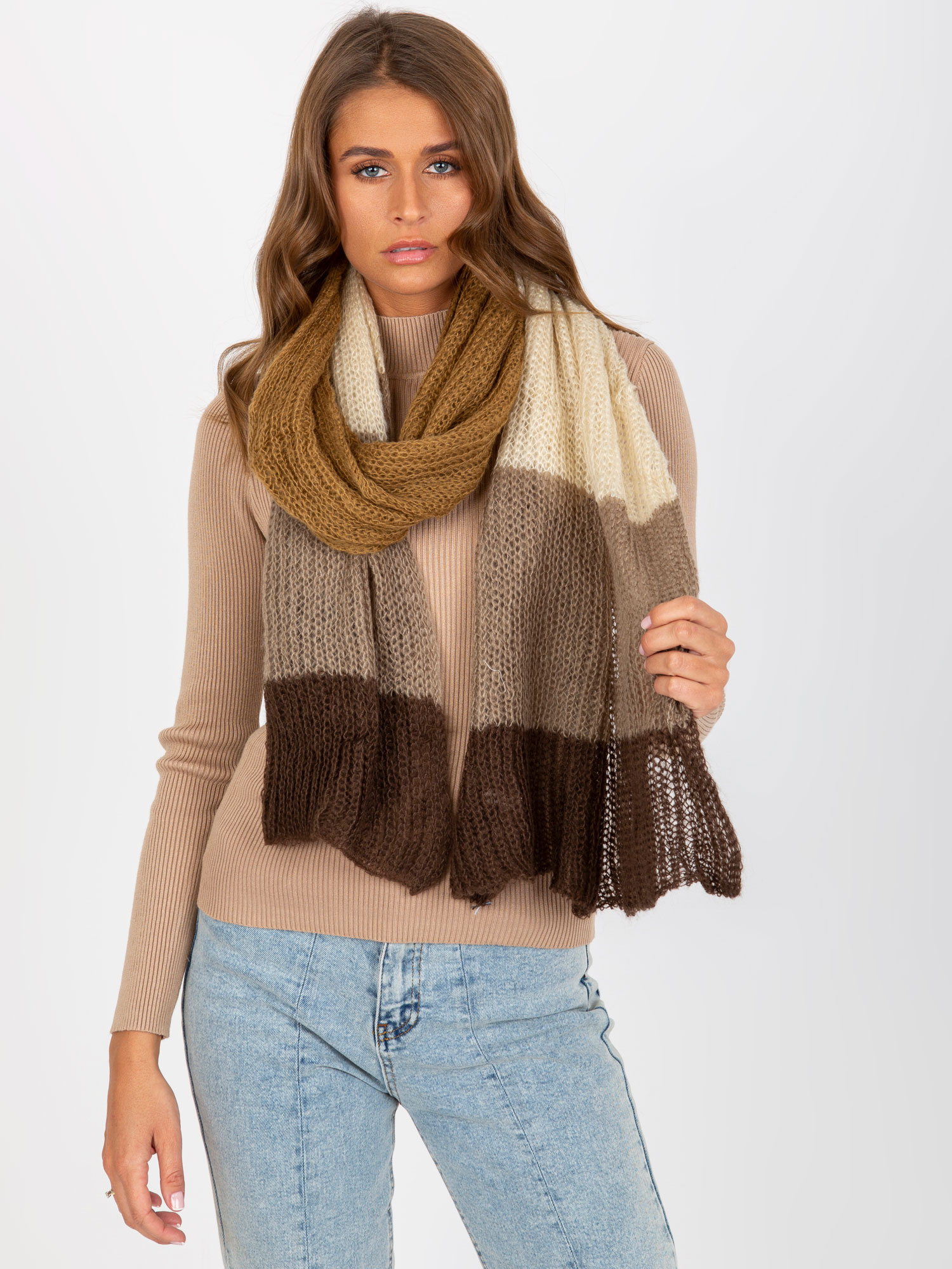Brązowo-beżowy damski szal zimowy z dzianiny .