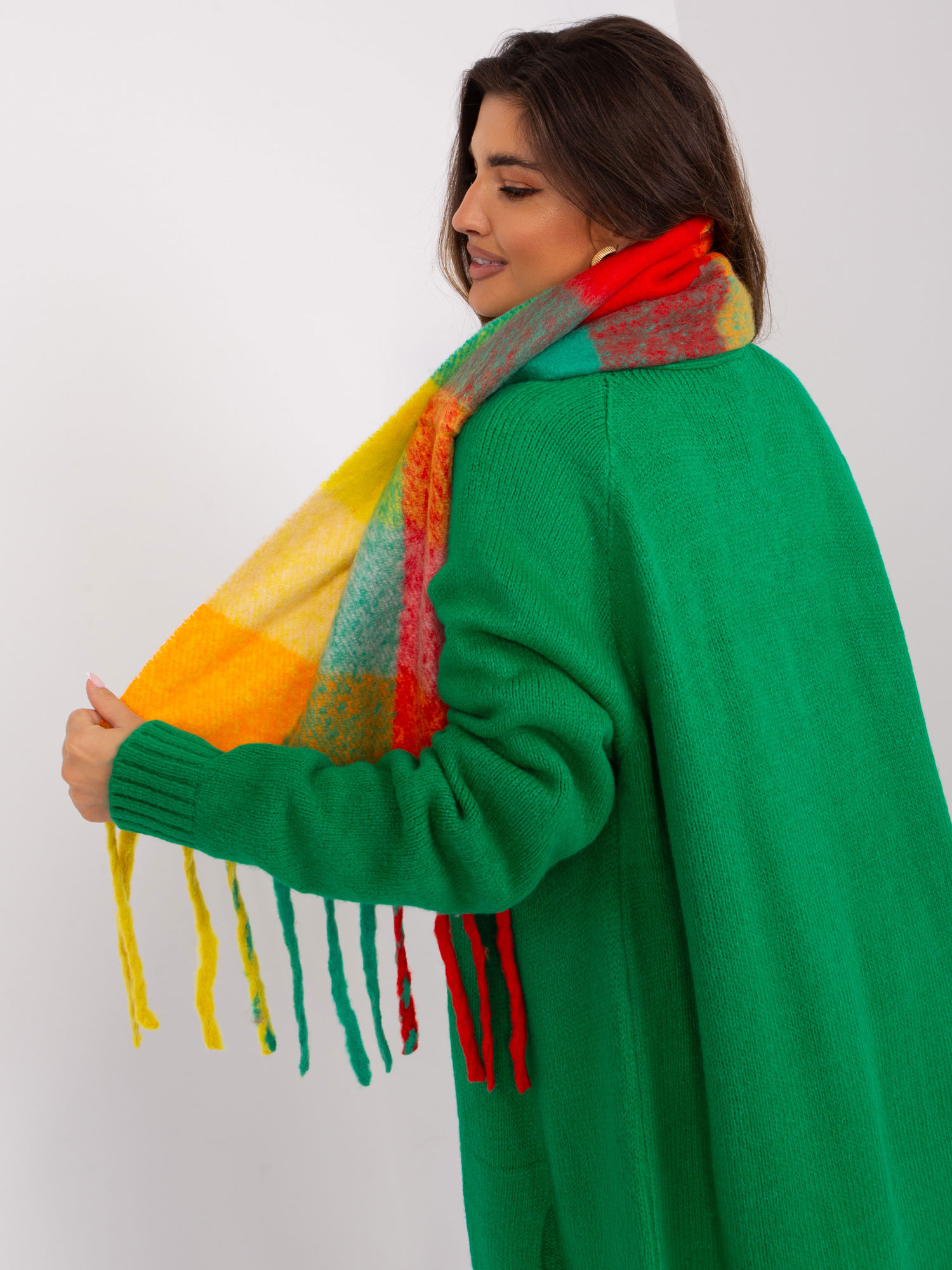 Zielono-żółty szal damski w kratę.