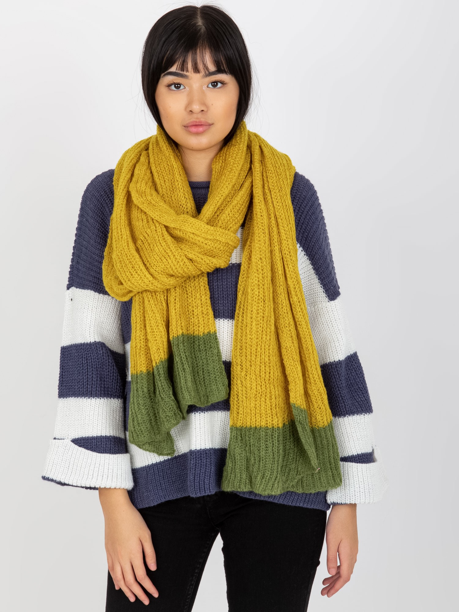 Żółto-zielony dwukolorowy szal damski z dzianiny .