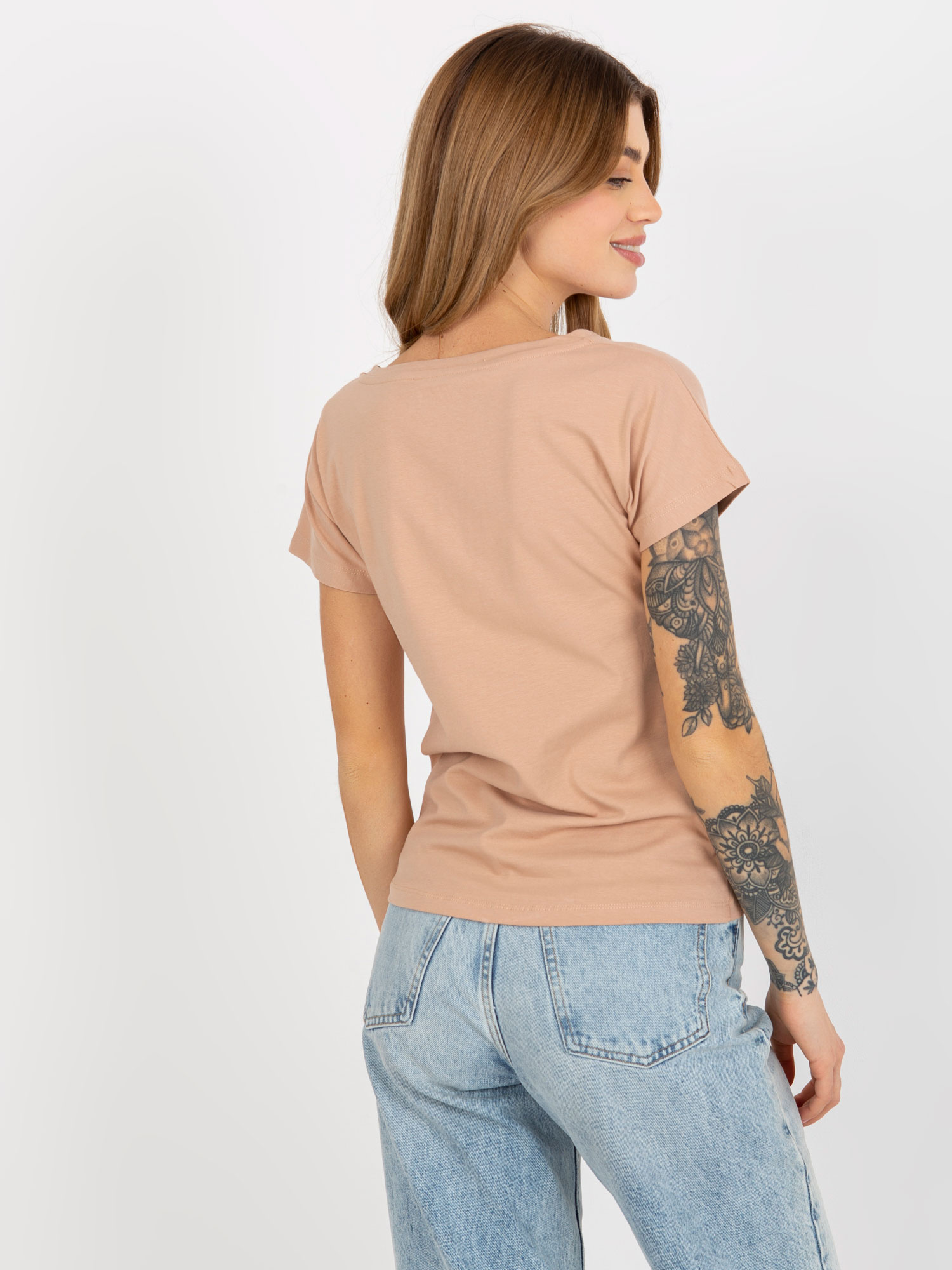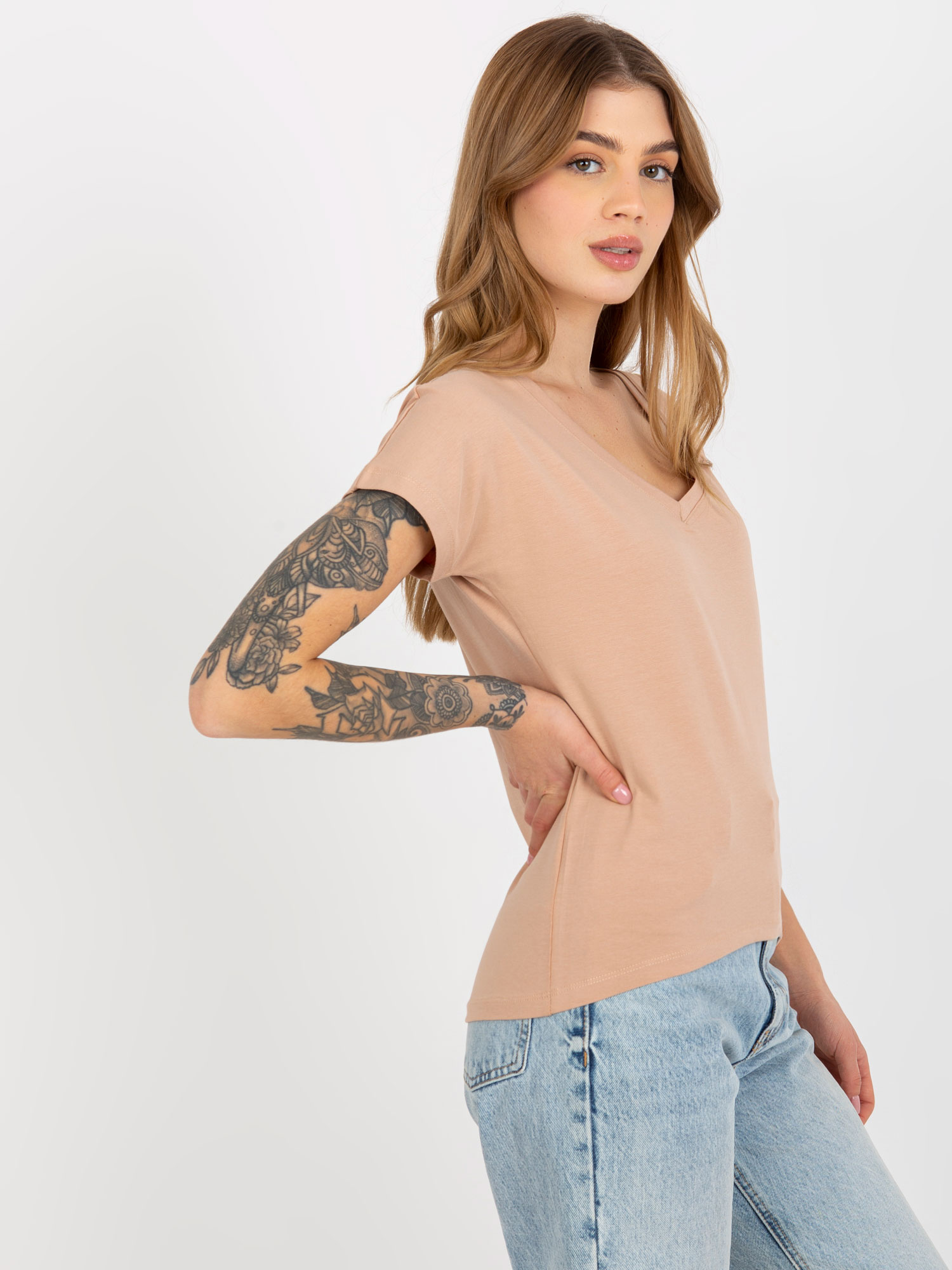 Beżowy klasyczny t-shirt basic z dekoltem V .