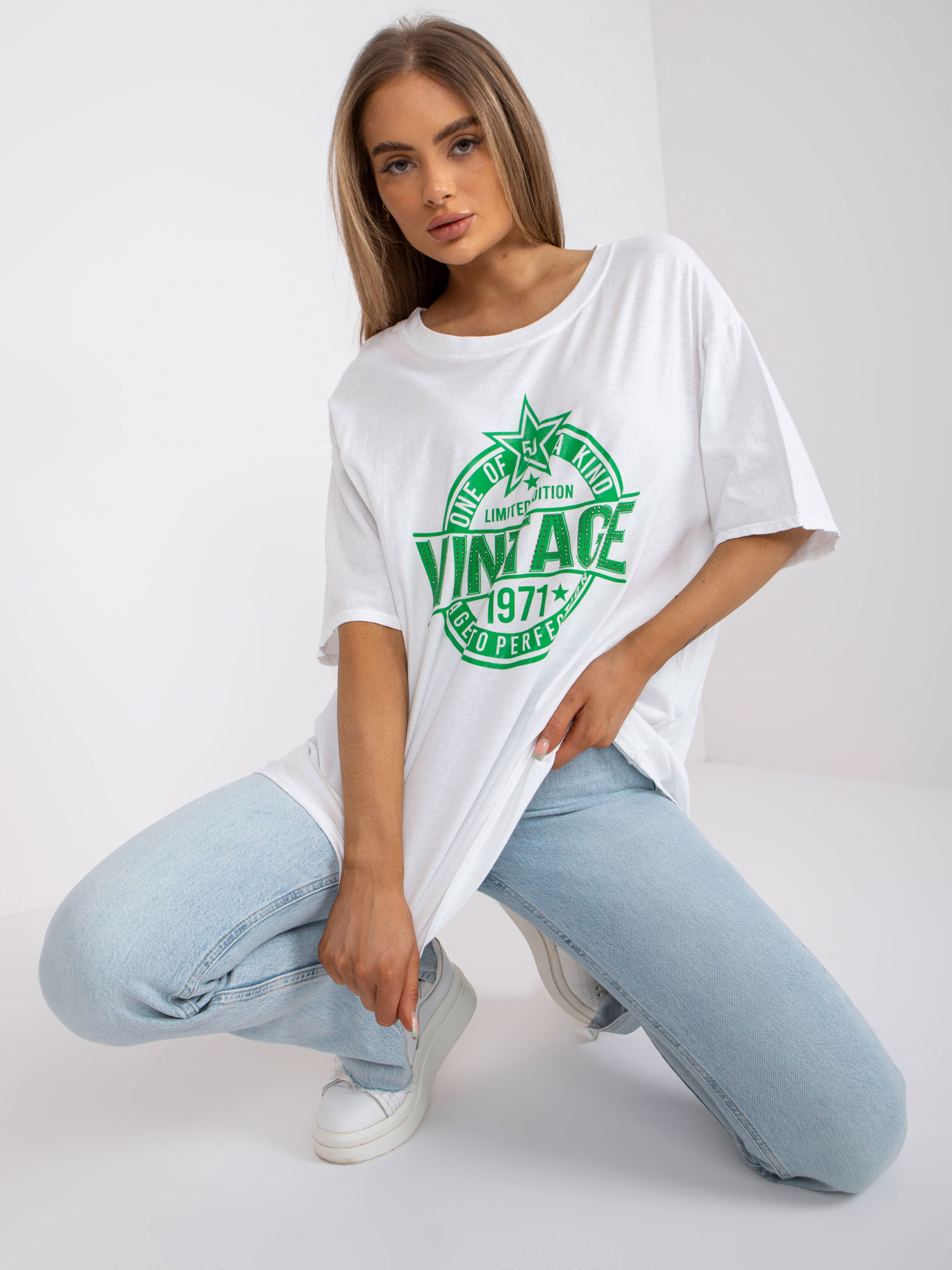 Wymiary t-shirta w rozmiarze one size mierzone na płasko: szerokość pod pachami – 56 cm, długość całkowita – 75 cm.