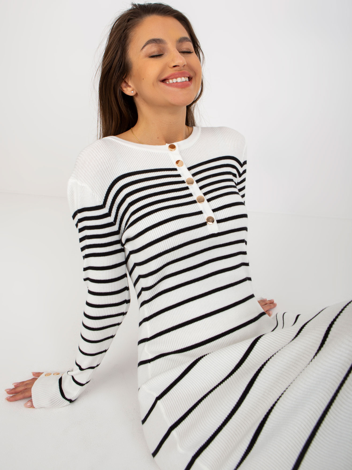Modelka ma na sobie rozmiar one size. Wymiary modelki: wzrost 175 cm, biust 84 cm, talia 65 cm, biodra 92 cm.