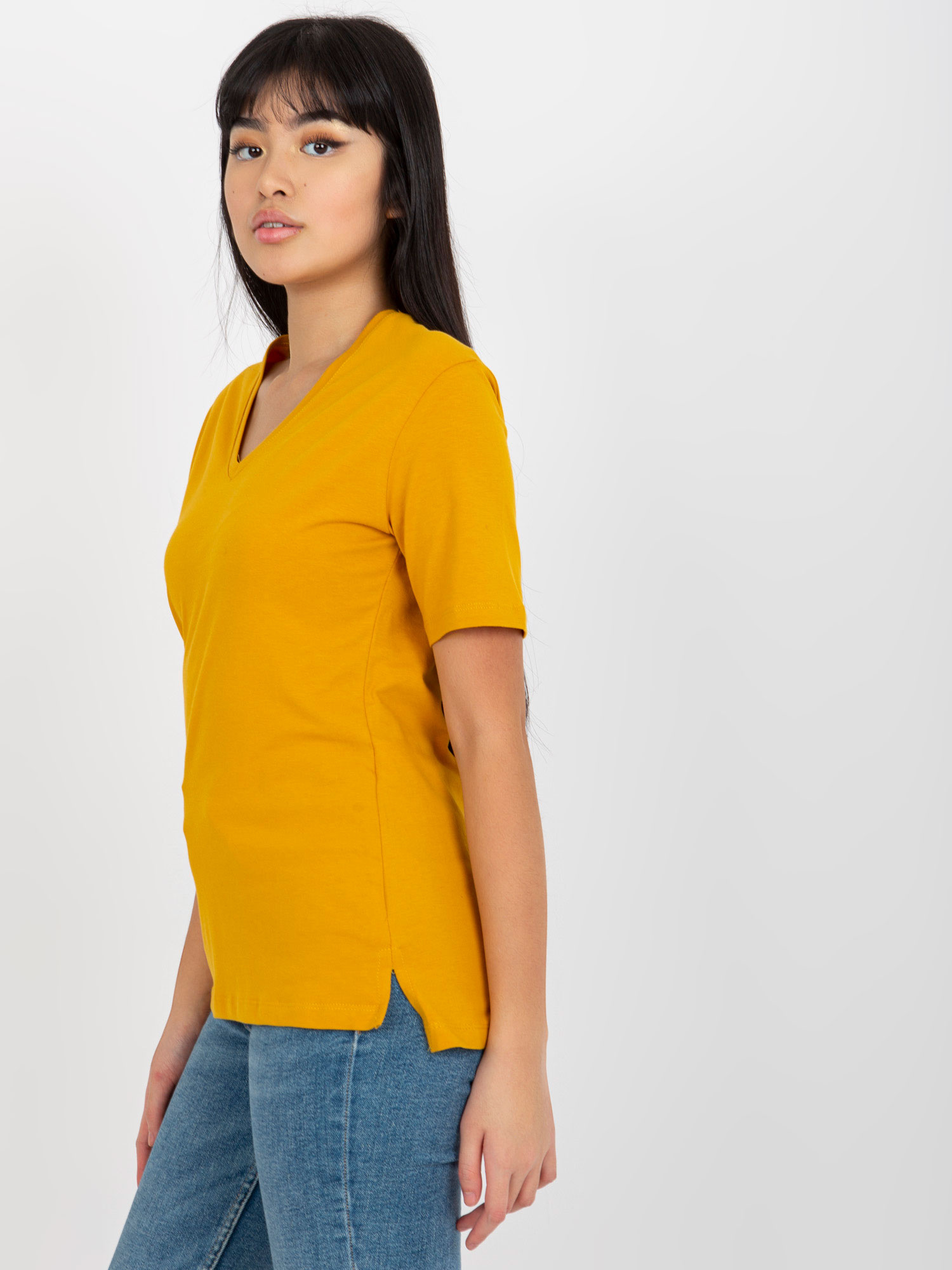 Ciemnożółty damski t-shirt basic z dekoltem V .