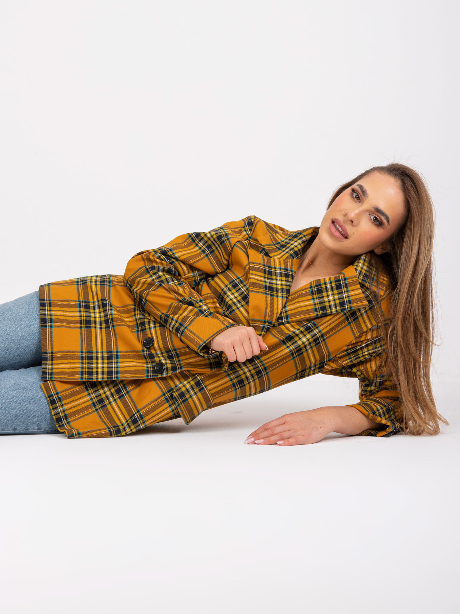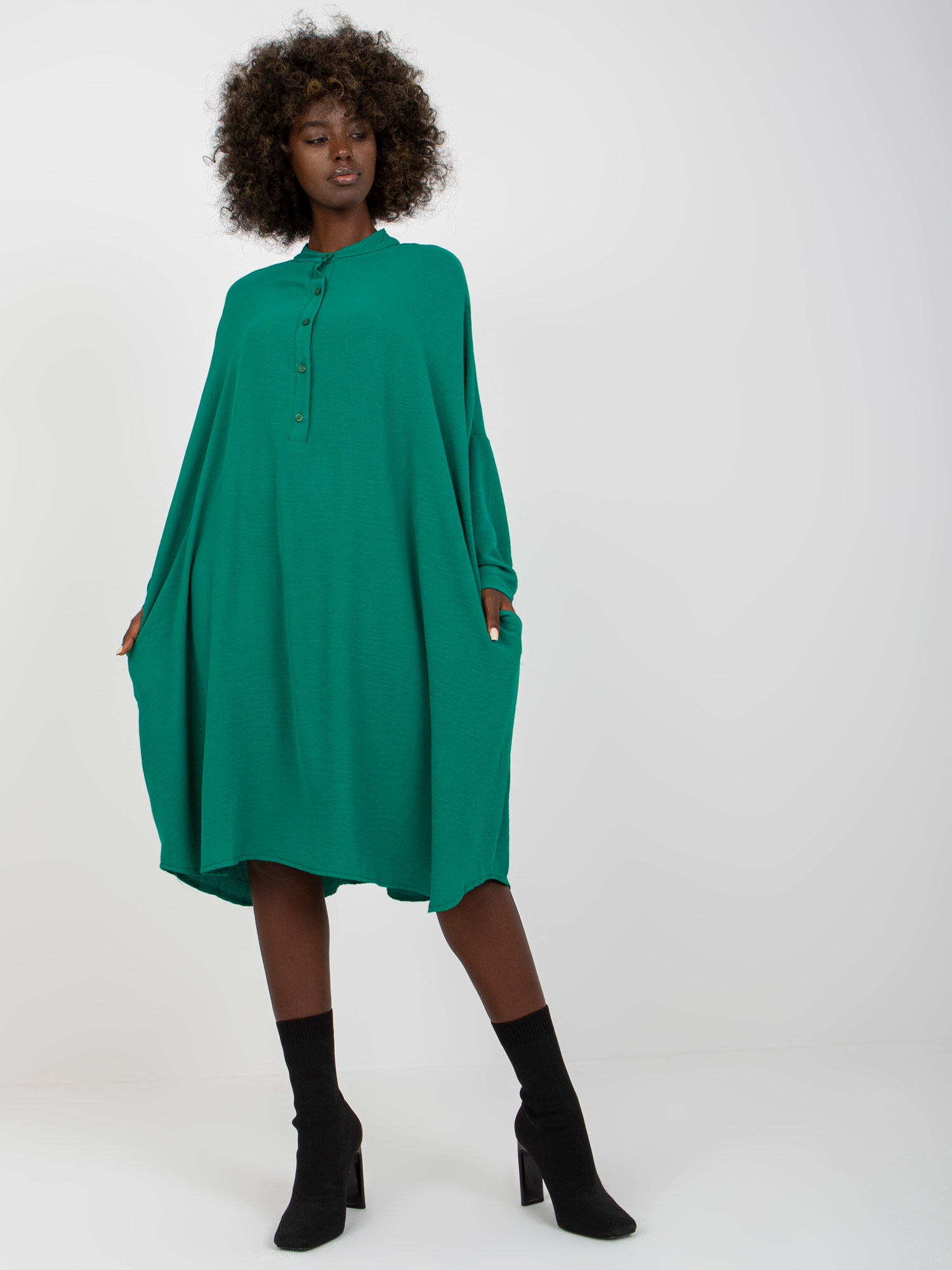 Modelka ma na sobie rozmiar one size. Wymiary modelki: wzrost 170 cm, biust 108 cm, talia 86 cm, biodra 120 cm.