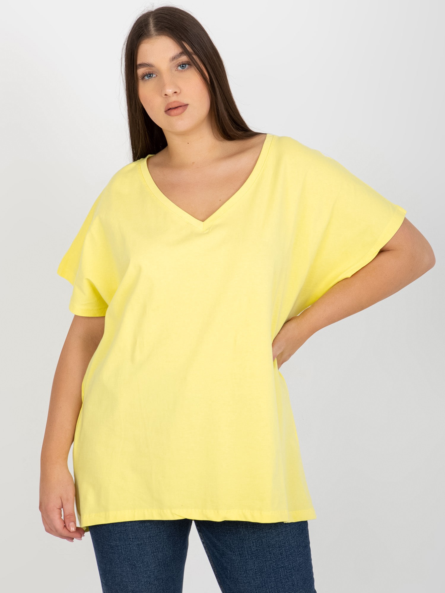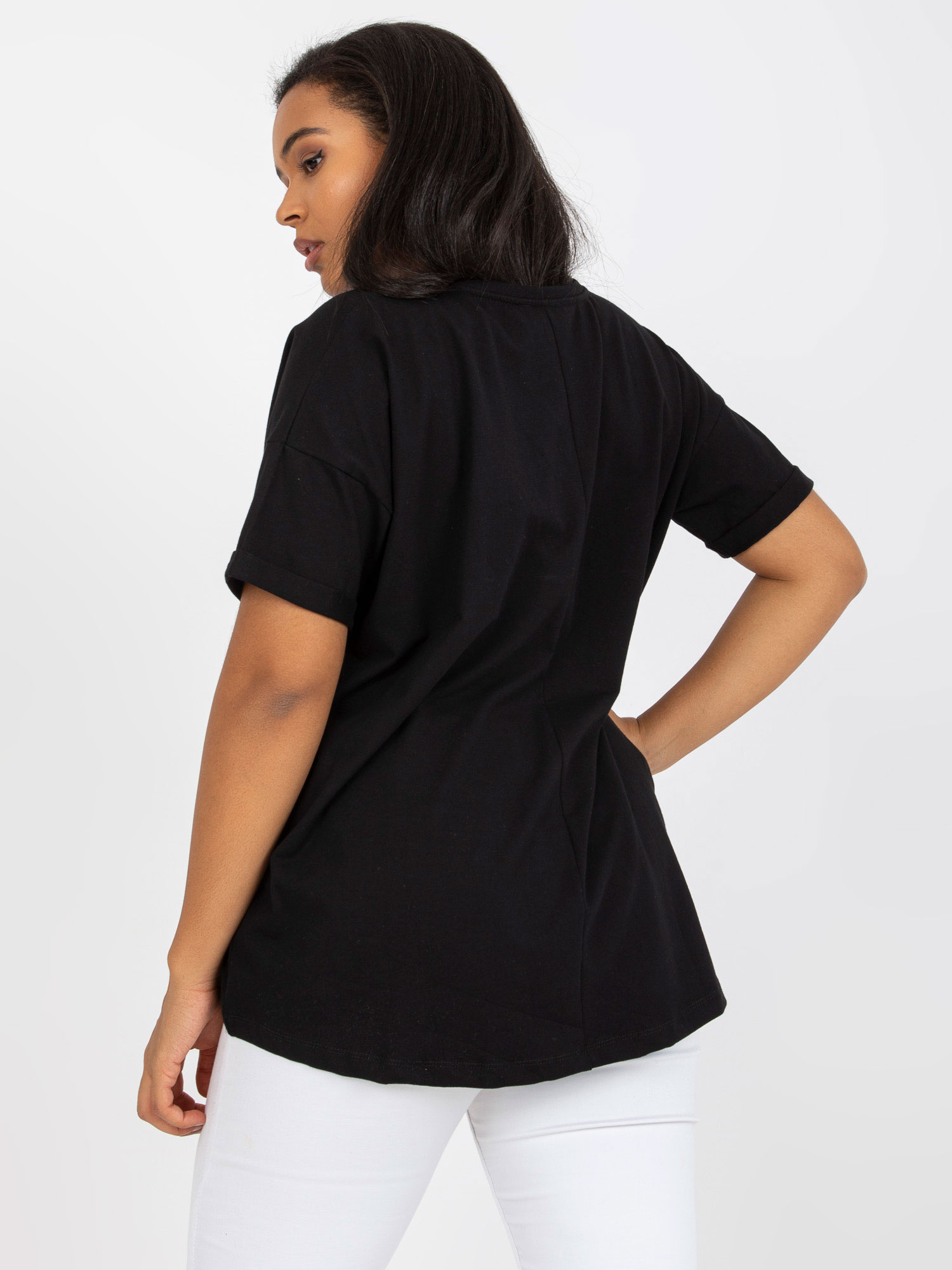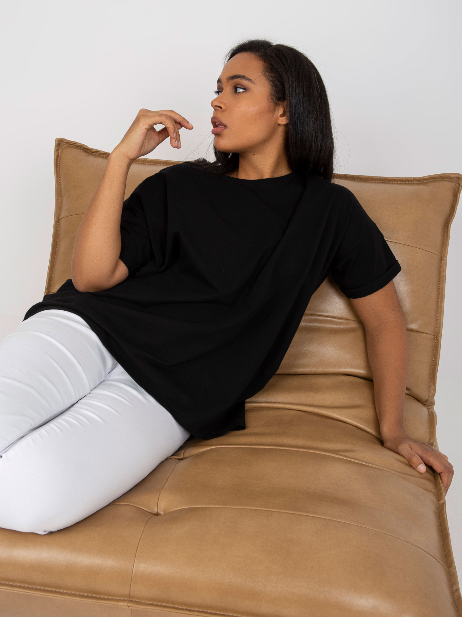 Wymiary t-shirta w rozmiarze one size mierzone na płasko: szerokość pod pachami – 63 cm, długość całkowita (przód) – 65 cm, długość całkowita (tył) – 74 cm.