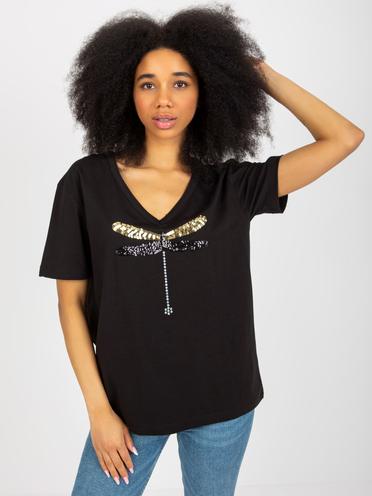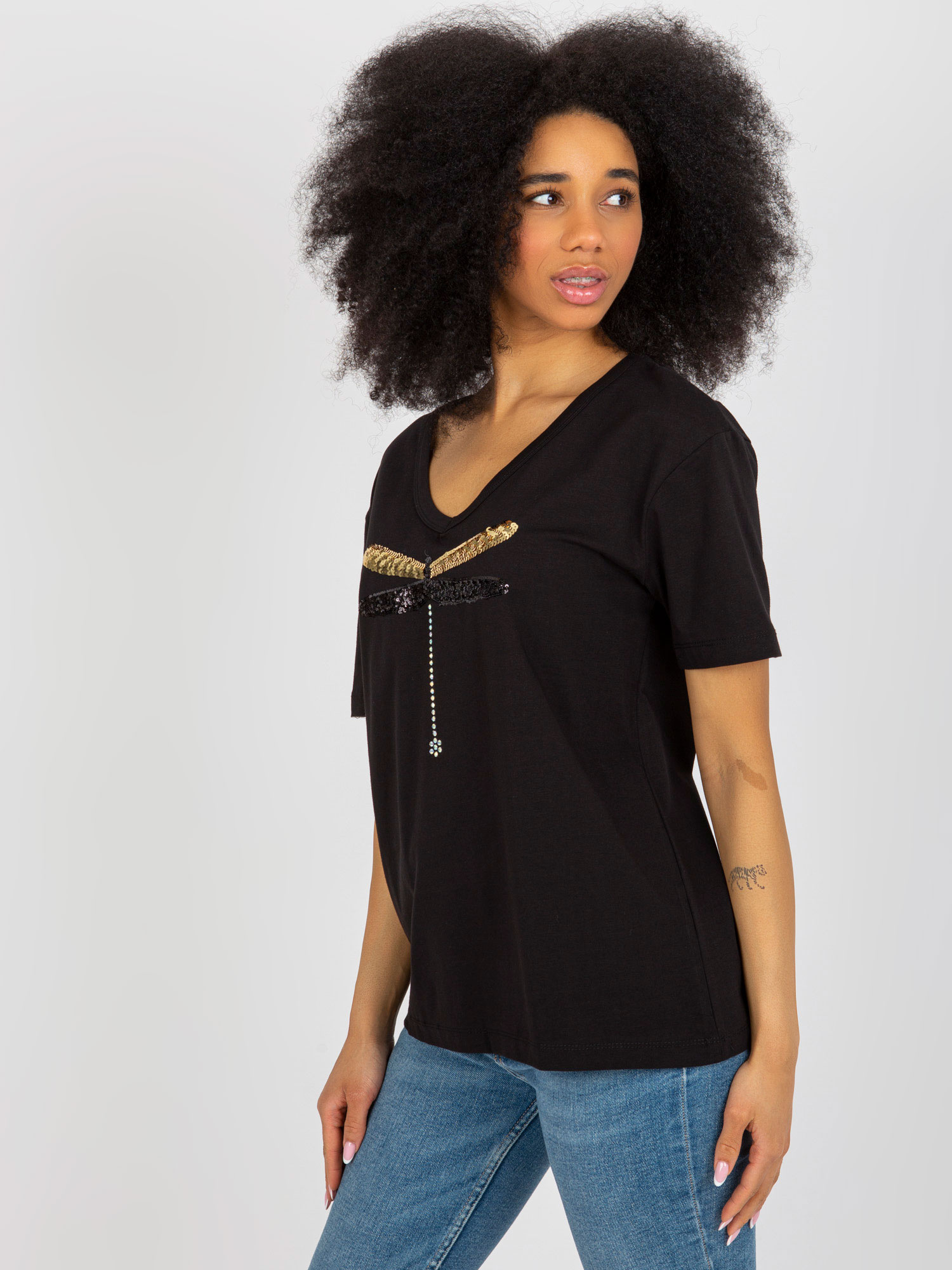 Czarny damski t-shirt z aplikacjami i dekoltem w serek .