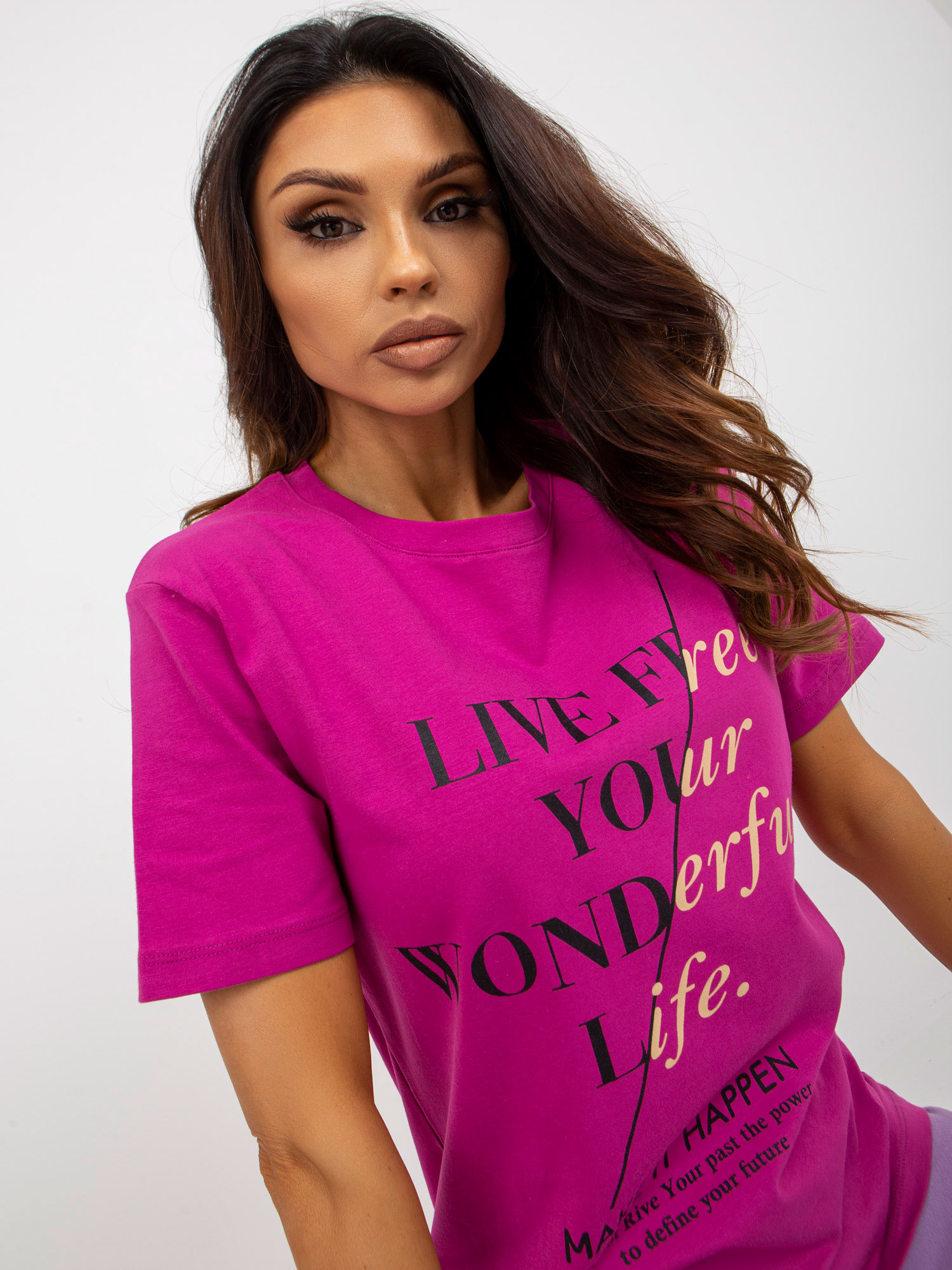 Fuksjowy damski t-shirt z napisami z bawełny .