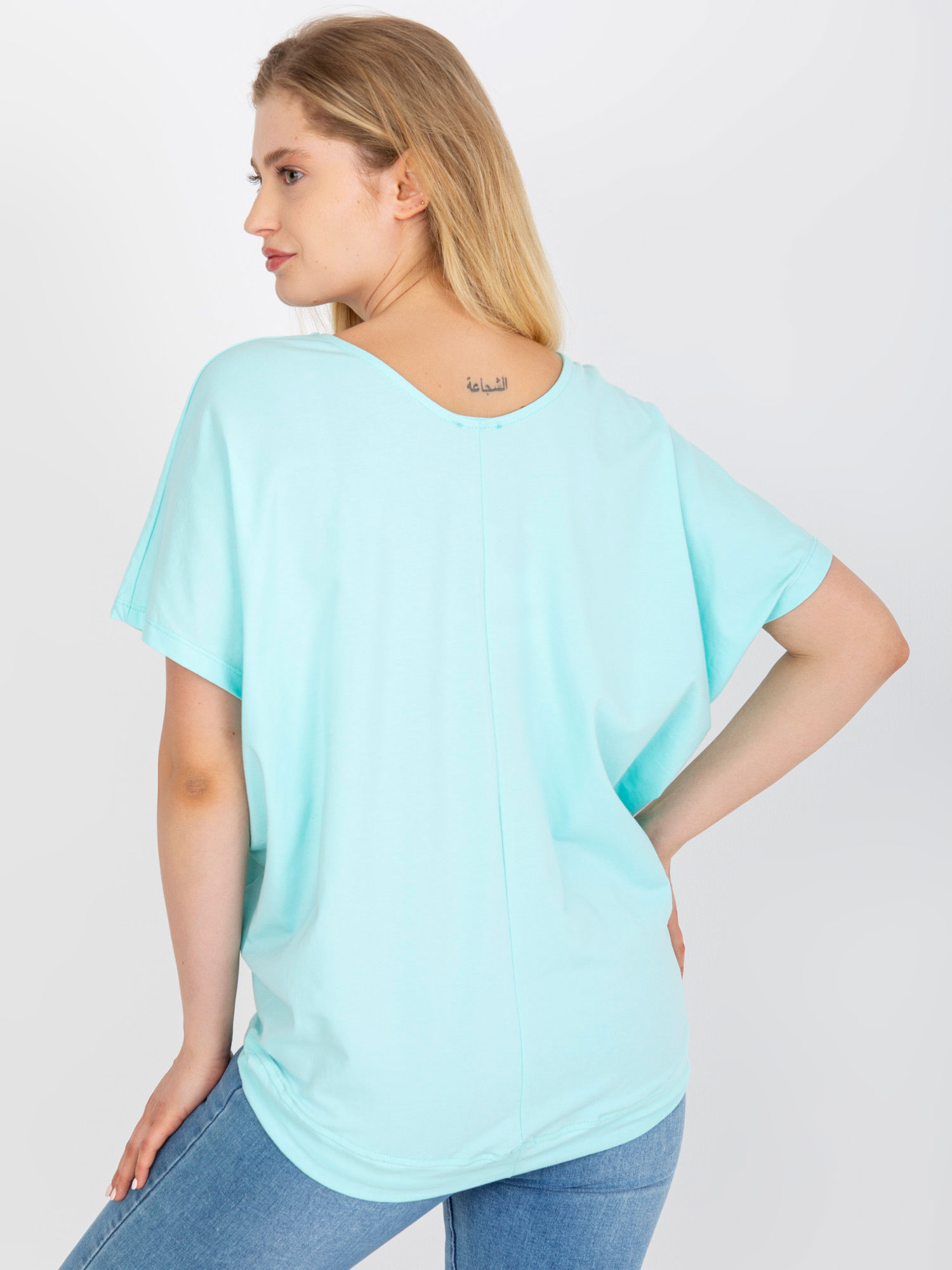 Wymiary t-shirta w rozmiarze one size mierzone na płasko: szerokość pod pachami – 67 cm, długość całkowita – 65 cm.