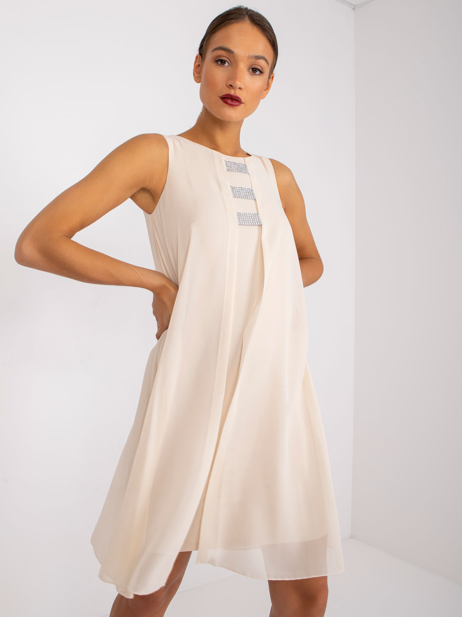 Modelka ma na sobie rozmiar one size. Wymiary modelki: wzrost 176 cm, biust 104 cm, talia 87 cm, biodra 119 cm.
