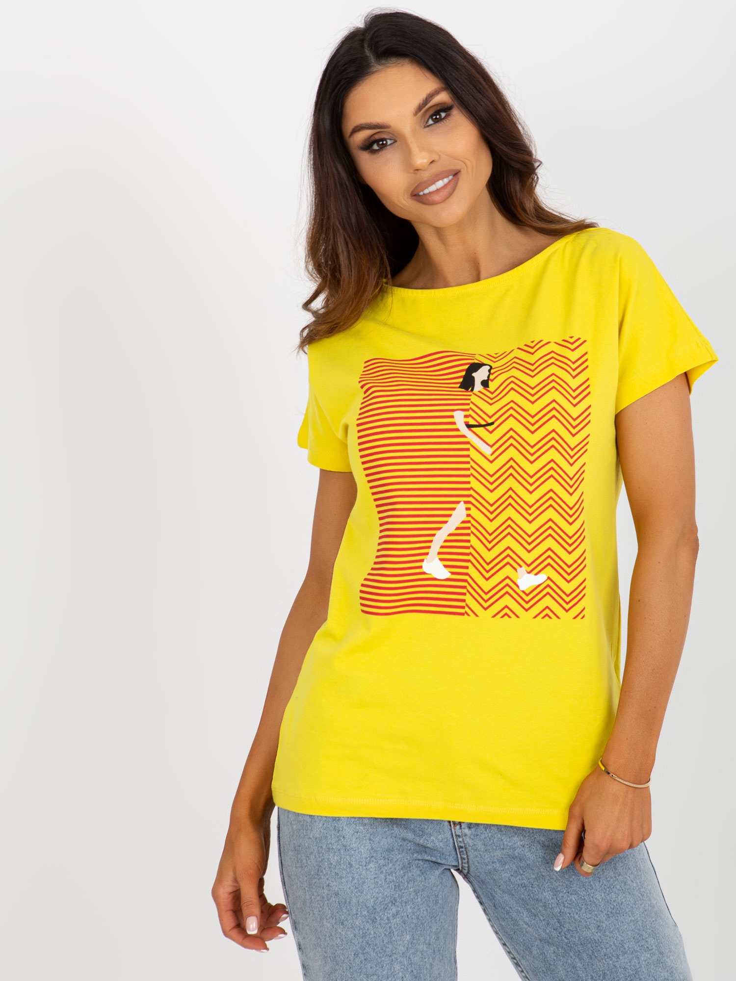 Żółty bawełniany damski t-shirt z nadrukiem .