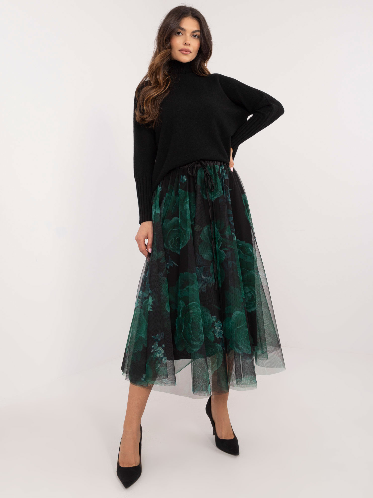 Modelka ma na sobie rozmiar S. Wymiary modelki: wzrost 167 cm, biust 82 cm, talia 59 cm, biodra 83 cm.
