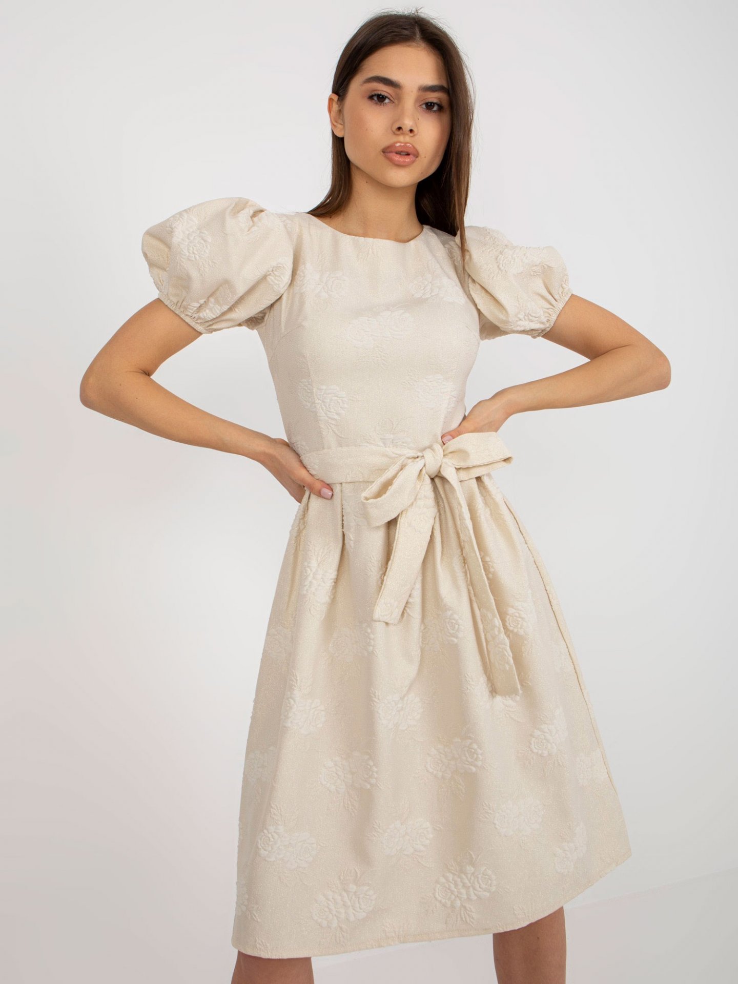 Modelka ma na sobie rozmiar S. Wymiary modelki: wzrost 175 cm, biust 85 cm, talia 63 cm, biodra 95 cm.
