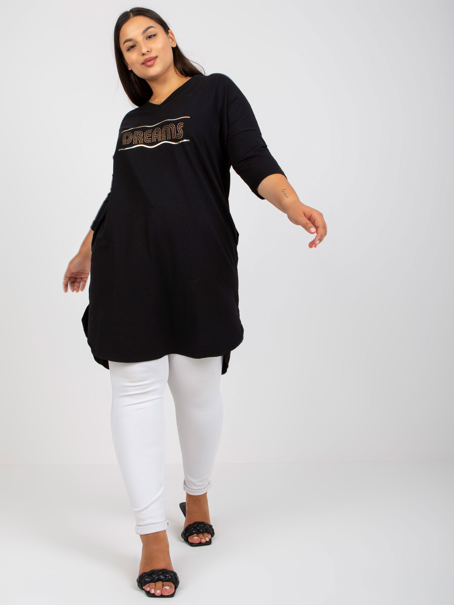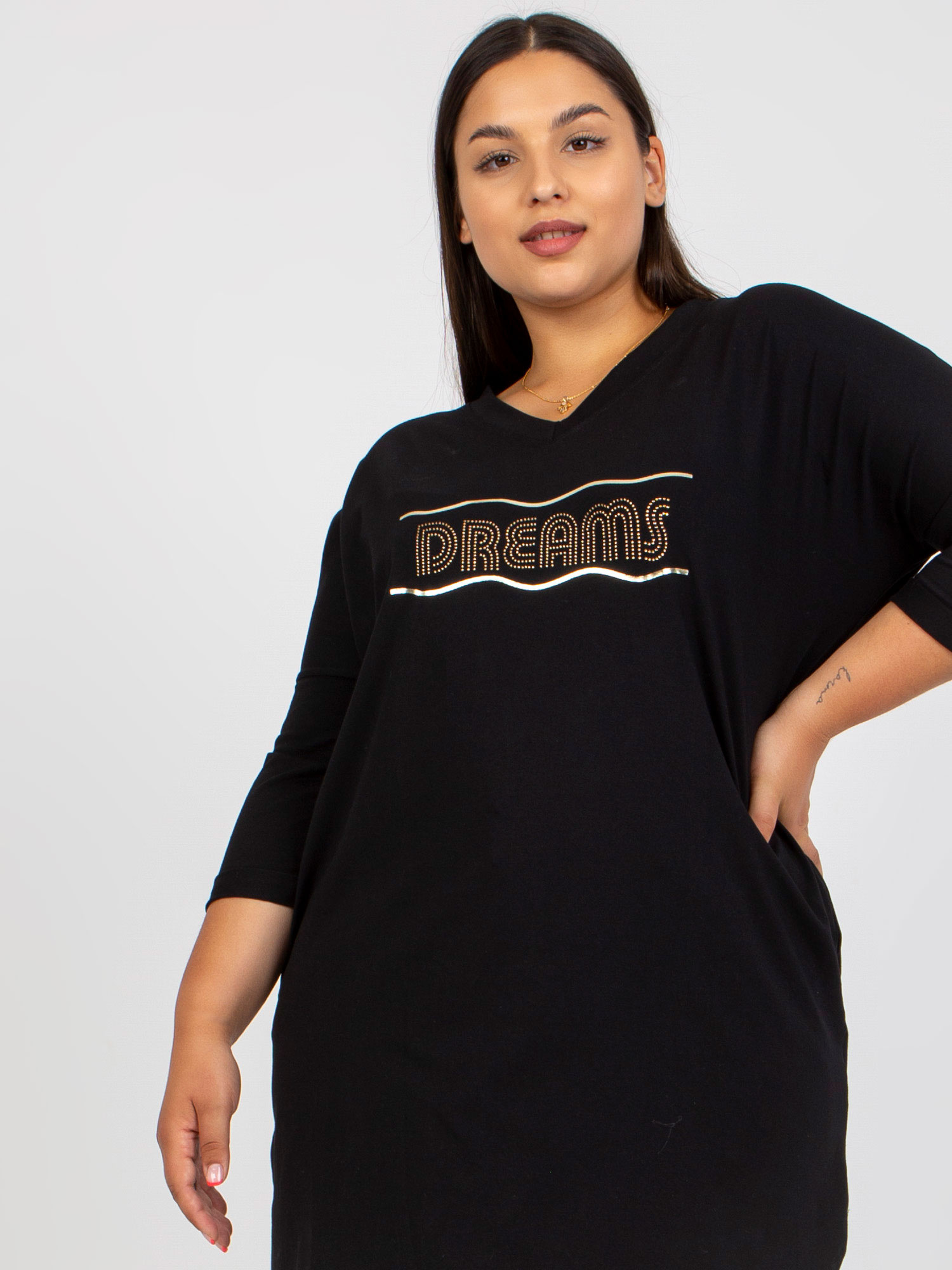 Wymiary tuniki w rozmiarze one size mierzone na płasko: szerokość pod pachami – 65 cm, długość rękawa – 39 cm, długość całkowita (przód) – 91 cm, długość całkowita (tył) – 100 cm .