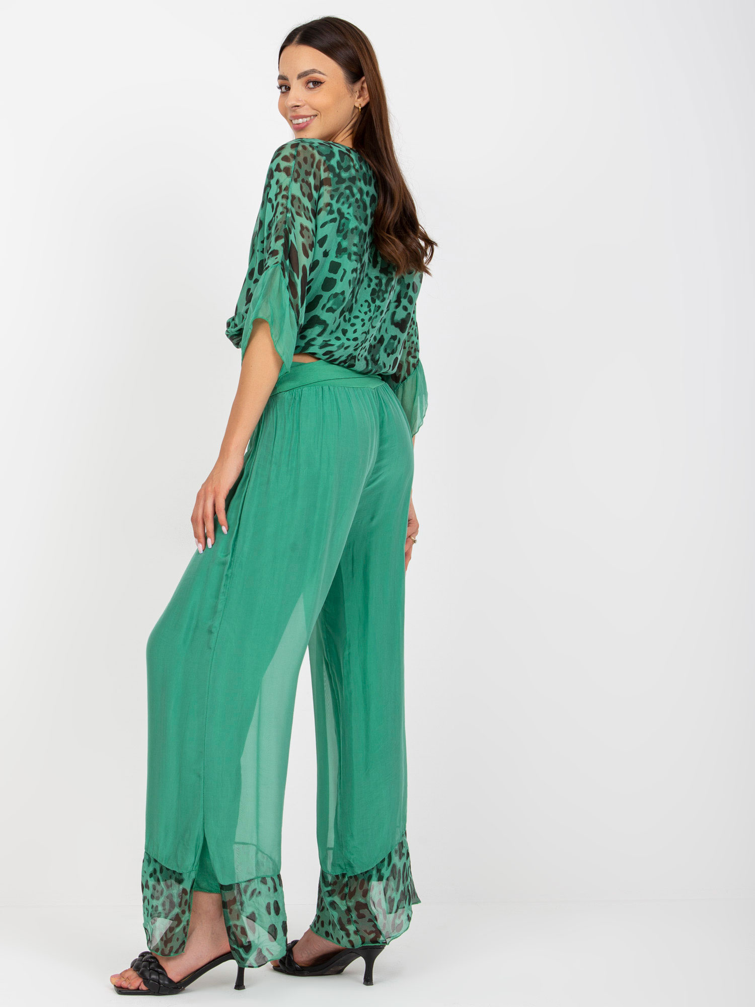 Wymiary tuniki w rozmiarze one size mierzone na płasko: szerokość pod pachami – 65 cm, długość rękawa – 39 cm, długość całkowita (przód) – 91 cm, długość całkowita (tył) – 100 cm .