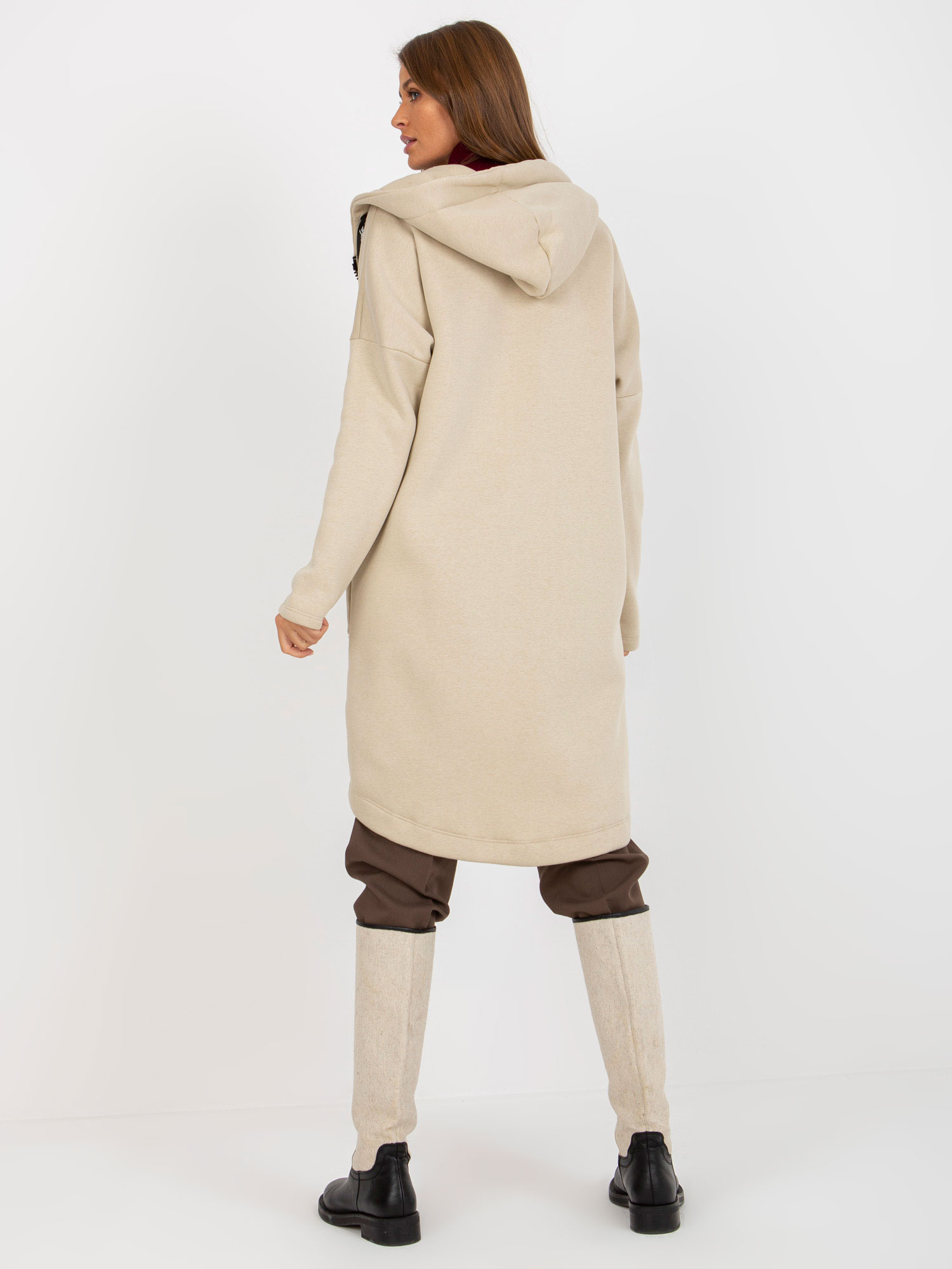 Wymiary sukienki w rozmiarze S/M mierzone na płasko: szerokość pod pachami – 62 cm, długość całkowita (przód) – 89 cm, długość całkowita (tył) – 95 cm, długość rękawa – 61 cm.
