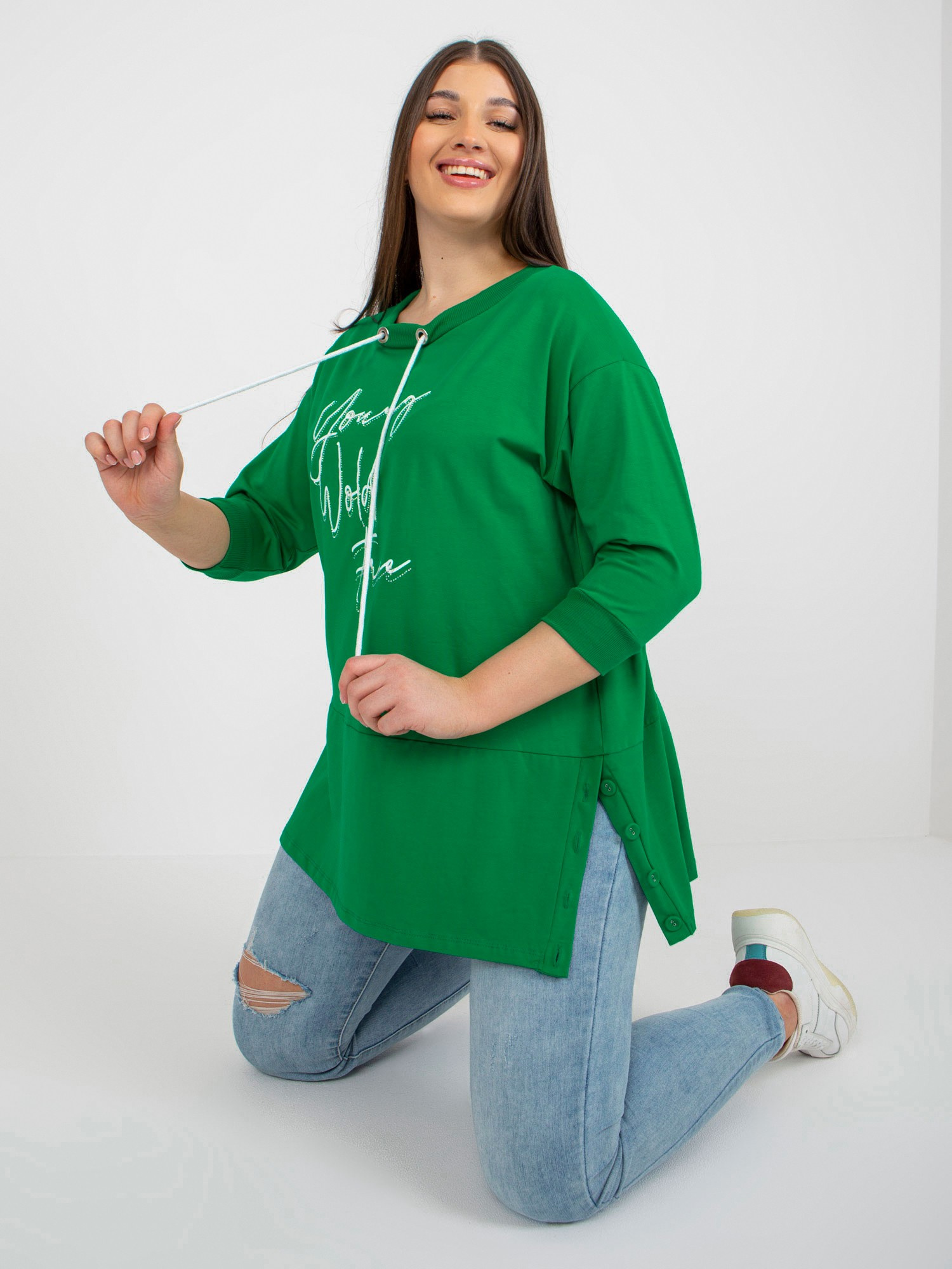 Zielona dłuższa bluzka plus size z napisami .