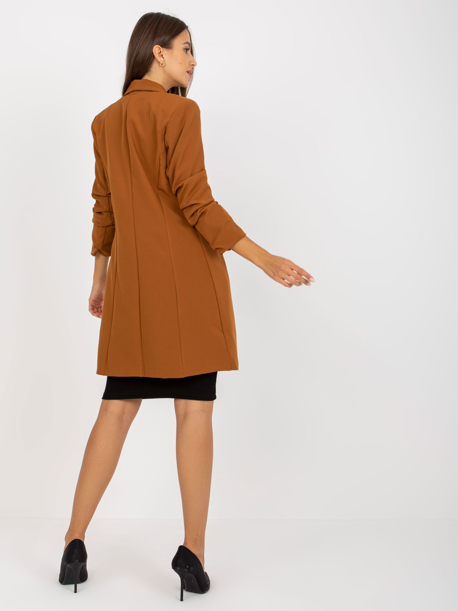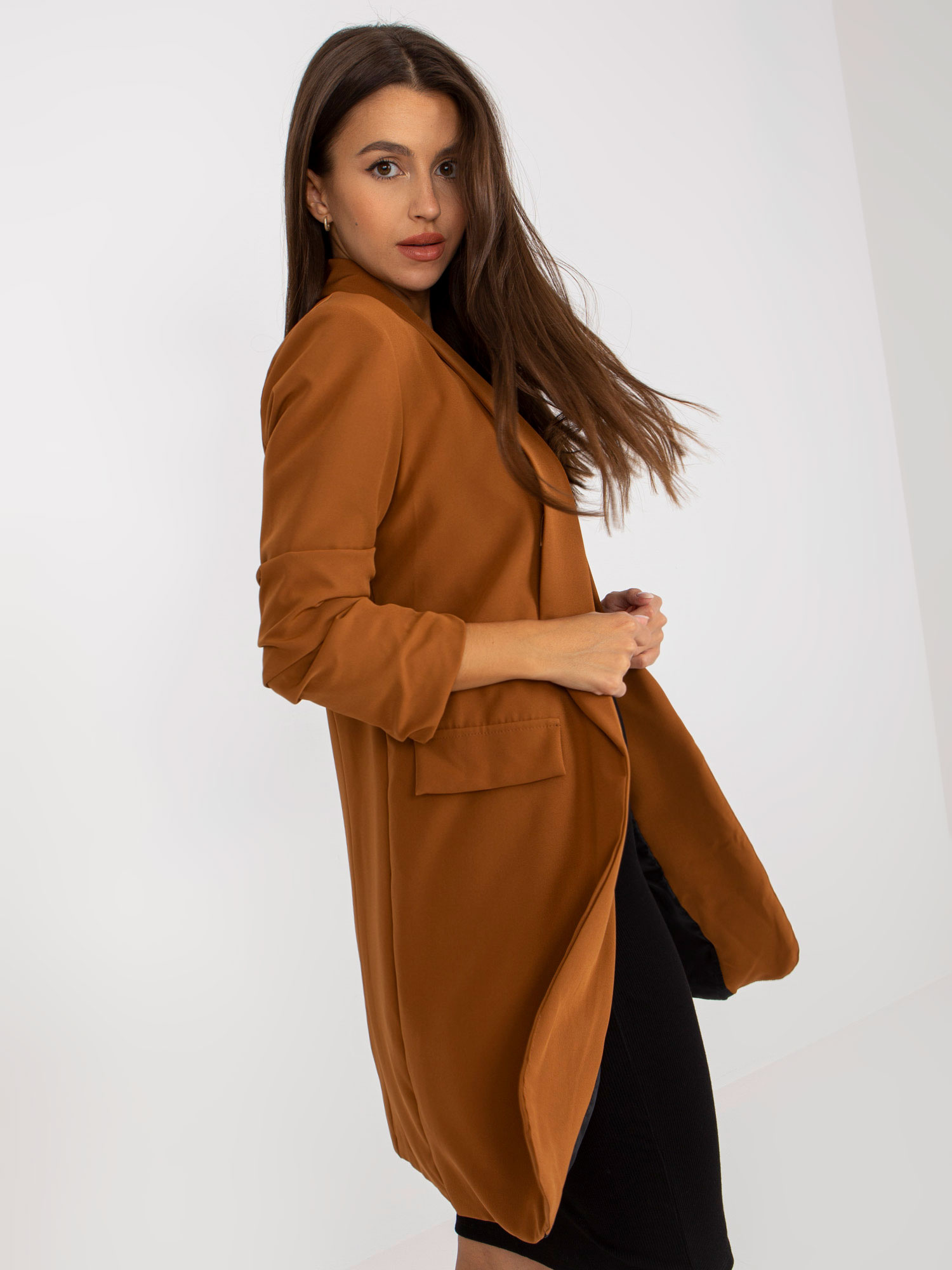 Jasnobrązowa długa marynarka damska.